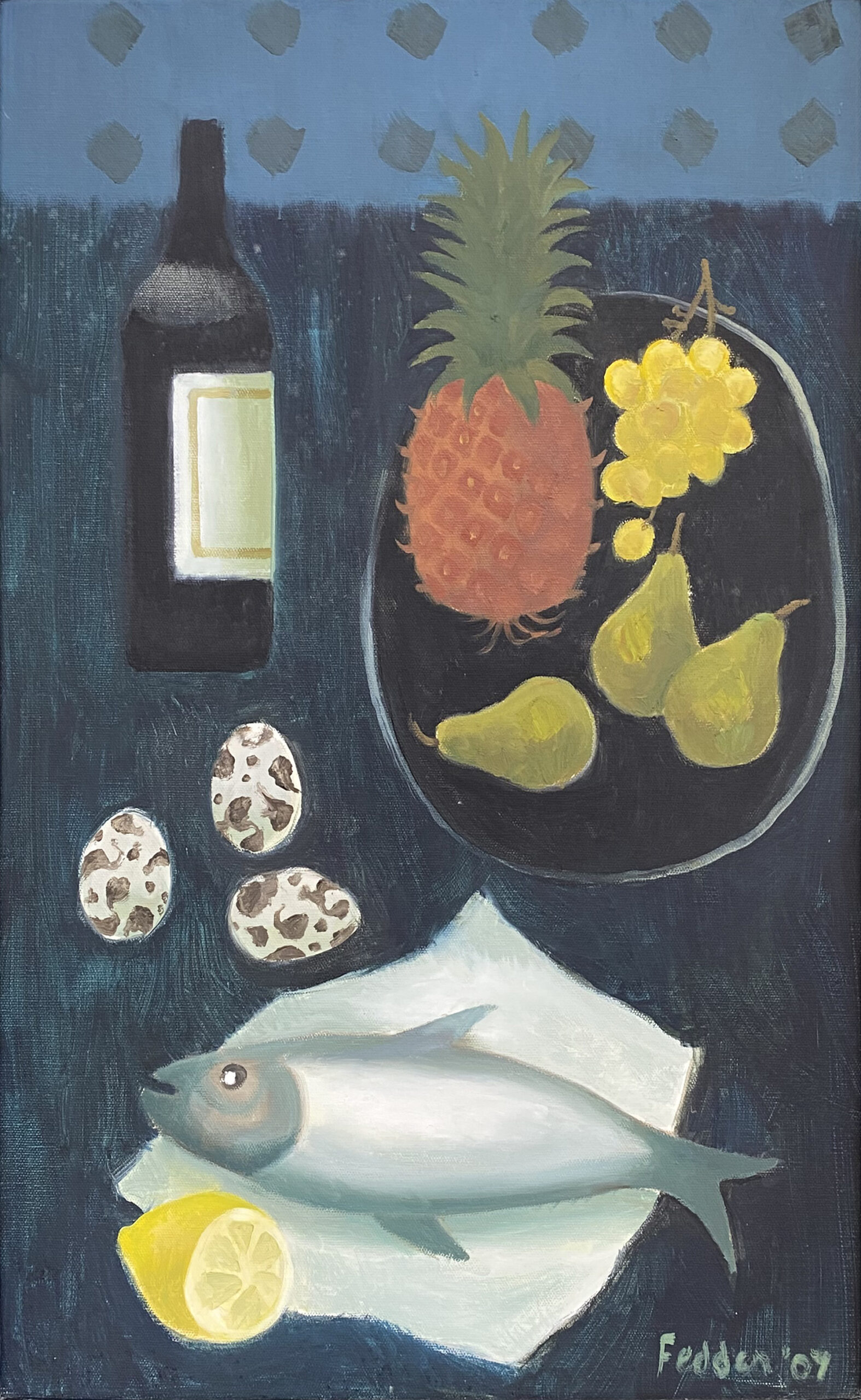 Among the typical characteristics of Mary Fedden’s work are a passion for bright colour and the use of flattened space – the rules of conventional perspective are largely ignored. She frequently goes back to her favourite still life, as in this example, Fish and Eggs, where a simple arrangement of fish, eggs, fruit and wine are highlighted against the dramatic dark background.